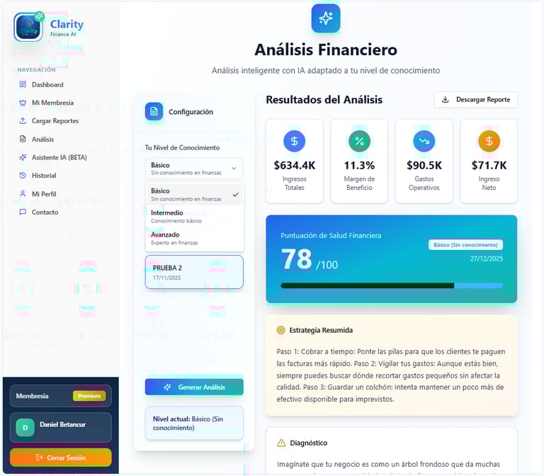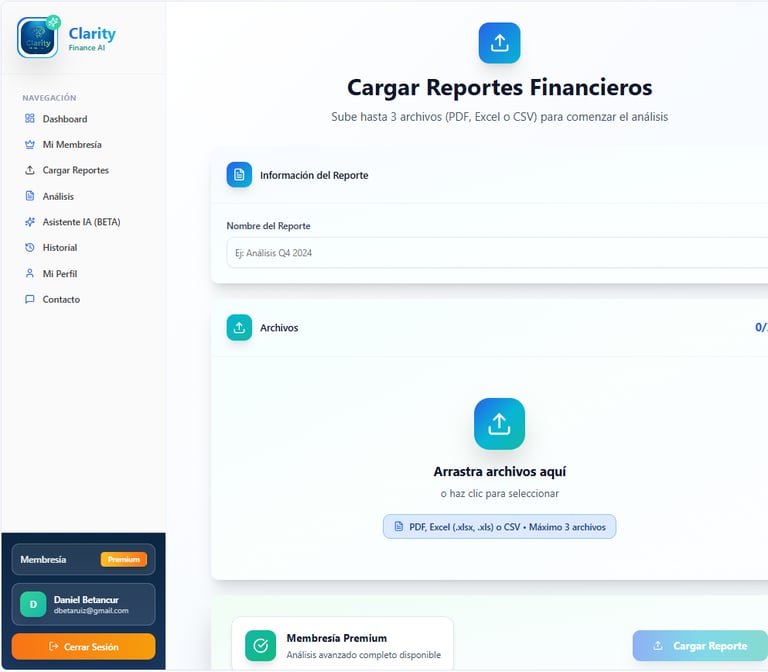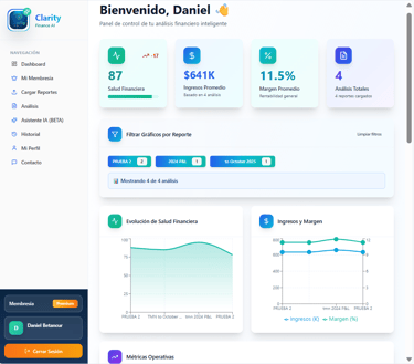 Deja de tomar decisiones a ciegas. Clarity Finance AI traduce tus estados financieros complejos a un idioma simple, diagnósticos claros y mejores decisiones en menos de 2 minutos.
